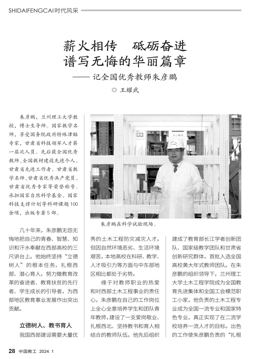 近日,《中國教工》2024年第一期專版刊發了我校土木工程學院全國優秀教師朱彥鵬老師事跡。原文如下: