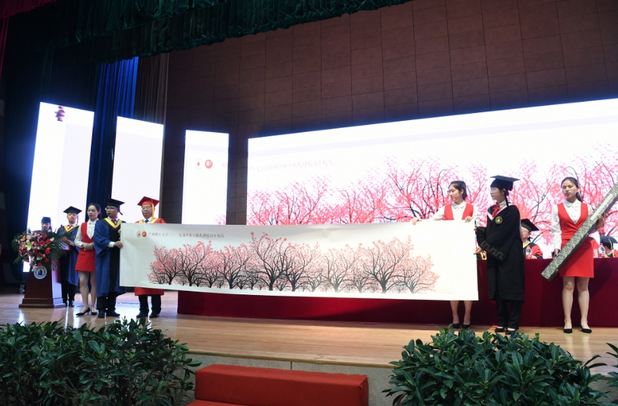 學(xué)校黨委書記夏天東接受畢業(yè)生贈禮。全體2019屆畢業(yè)生精心準(zhǔn)備了“紅柳禮贊圖”贈予母校,畢業(yè)生們蘸取紅色印泥為母校點贊,將自己對母校的感恩、不舍、熱愛繪制在畫卷中,在母校百年華誕的特殊日子里,祝愿母校弦歌不輟,桃李滿園盡是春!