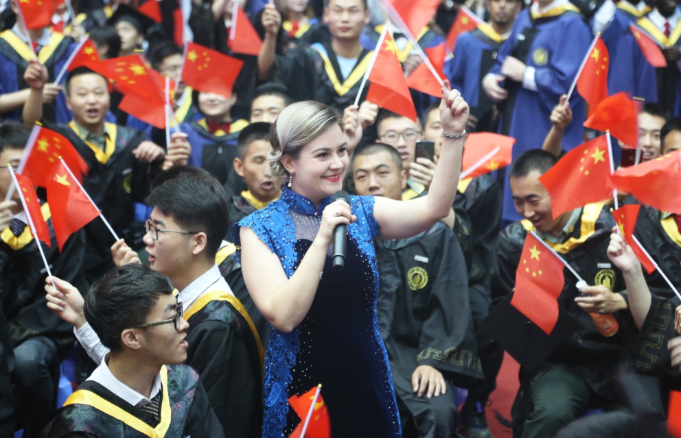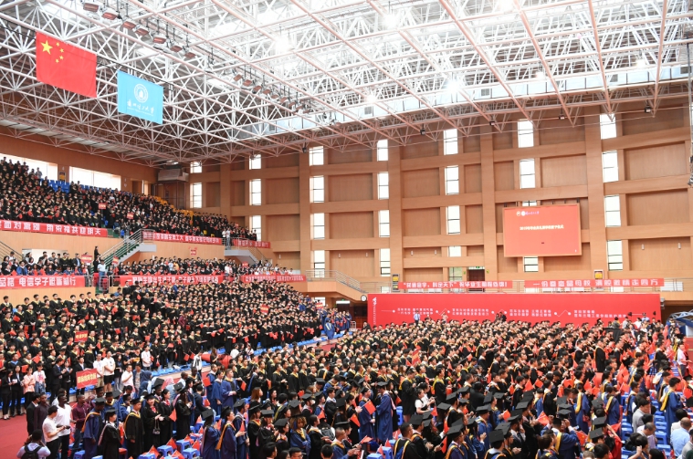 上午9:00,畢業(yè)典禮在雄壯的中華人民共和國國歌歌聲中開始,2019屆碩士畢業(yè)生何旭和本科畢業(yè)生李萬蓉主持畢業(yè)典禮。