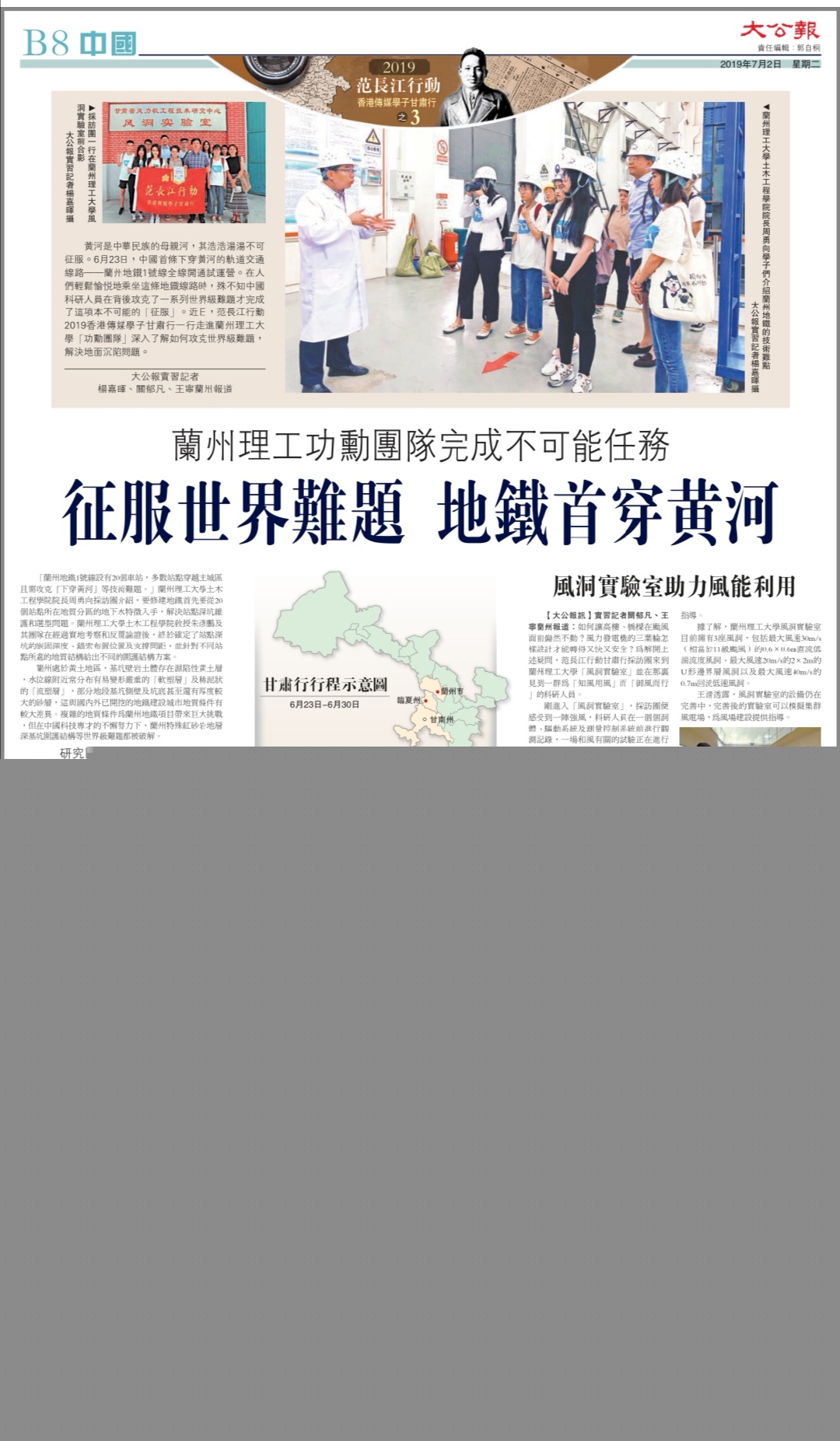 黃河是中華民族的母親河,其浩浩湯湯不可征服。6月23日,中國首條下穿黃河的軌道交通線路──蘭州地鐵1號線全線開通試運營。在人們輕鬆愉悅地乘坐這條地鐵線路時,殊不知中國科研人員在背后攻克了一系列世界級難題才完成了這項本不可能的“征服”。近日,范長江行動2019香港傳媒學子甘肅行一行走進蘭州理工大學“功勳團隊”深入了解如何攻克世界級難題,解決地面沉陷問題。/大公報實習記者 楊嘉暉、關郁凡、王寧蘭州報道