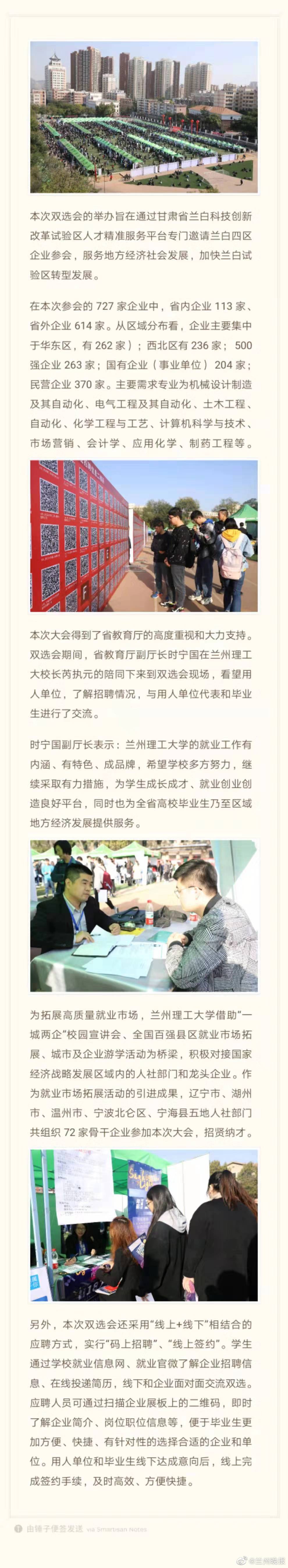 【規(guī)模空前丨727家用人單位涌進蘭州理工大選“材”】10月20日,“百年蘭理 春華秋實·蘭州理工大學(xué)2019年秋季畢業(yè)生就業(yè)雙向選擇洽談會暨蘭白科技創(chuàng)新改革試驗區(qū)人才精準(zhǔn)服務(wù)平臺招聘會”在該校蘭工坪校區(qū)田徑場成功舉辦。本次大會規(guī)模再創(chuàng)該校歷史新高,也是甘肅省高校校園招聘會規(guī)模最大的一次。蘭州日報社全媒體記者馬文艷