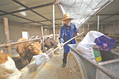 化希青在下莊村農(nóng)業(yè)合作社的牛棚里喂牛。