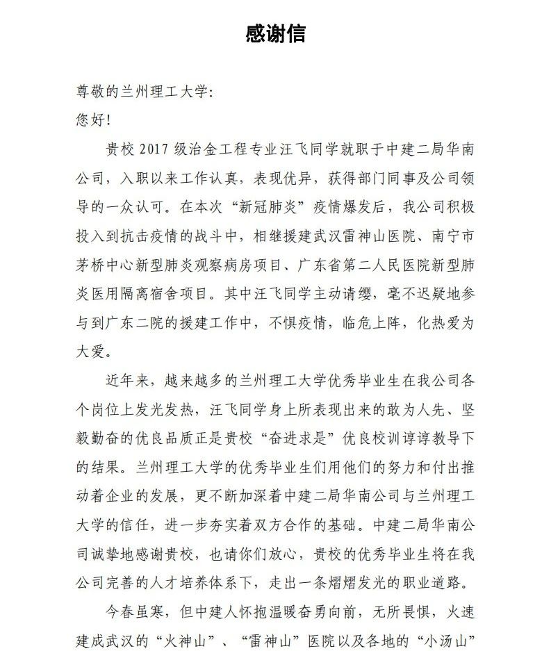 2020-03-13近日,中建二局華南公司給蘭州理工大學發來一封感謝信。信中寫到,學校2017屆冶金工程專業畢業生汪飛,在此次新冠肺炎疫情防控中,主動請纓,參與廣東省第二人民醫院新冠肺炎醫用隔離宿舍項目的援建,不懼危險,化熱愛與大愛,充分彰顯了蘭州理工大學學子堅毅勤奮的優良品質。