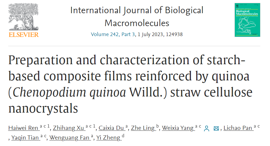 近日,生命科學與工程學院生物資源開發與環境健康創新研究團隊在中科院一區化學類TOP期刊《International Journal of Biological Macromolecules》(IF = 8.025)發表了題為“Preparation and characterization of starch-based composite films reinforced by quinoa (Chenopodium quinoa Willd.) straw cellulose nanocrystals”的研究論文(DOI: 10.1016/j.ijbiomac.2023.124938)。該論文以蘭州理工大學為第一單位和通訊單位,任海偉教授為第一作者,2020級碩士研究生徐志航為共同第一作者,楊偉霞博士為通訊作者。