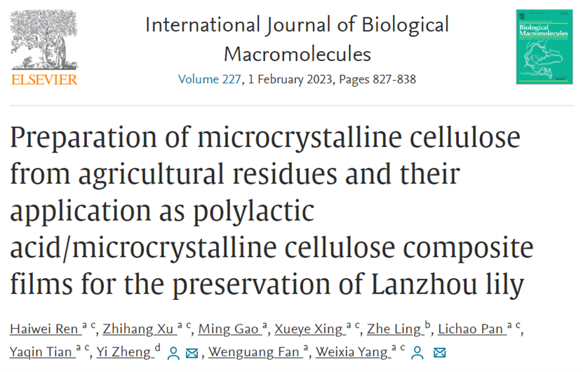 早前,團隊2020級碩士研究生徐志航還在該期刊發表了題為“Preparation of microcrystalline cellulose from agricultural residues and their application as polylactic acid/microcrystalline cellulose composite films for the preservation ofLanzhou lily”的研究成果,該研究從甜高粱、白酒糟、中藥渣和菊芋秸稈中制得微晶纖維素(MCC),再將MCC與聚乳酸(PLA)復合制得MCC/PLA膜材料。該工作系統地研究了不同添加量的MCC對復合膜物理化學性能的影響效果;并詳細地研究了MCC/PLA膜材料對蘭州百合的保鮮效果。該研究成果為農業廢棄物在食品保鮮中的應用提供了一定的理論基礎和技術依據。