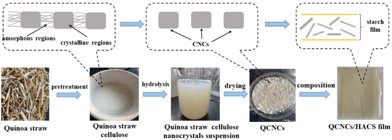 該研究以藜麥秸稈為原料,通過一系列化學處理方法制備得到平均長度190.29 ± 125.25 nm,平均寬度20.34 ± 4.69 nm,結晶度83.47%的高純度纖維素納米晶(QCNCs),并將其應用于高直鏈玉米淀粉(HACS)復合膜的保鮮性能改善研究。通過響應面優化確定了QCNCs的最佳制備條件為60%(w/w)硫酸濃度、50°C反應溫度和130min反應時間;借助SEM、XRD、TEM等表征分析手段對比分析了不同處理階段的微觀結構。進一步研究發現,添加4-6 wt%的QCNCs能明顯改善HACS復合膜力學性能,提高復合膜對水蒸氣和氧氣的阻隔能力。該研究為藜麥秸稈的高值化利用及QCNCs在淀粉基復合膜中的應用奠定了理論基礎。
