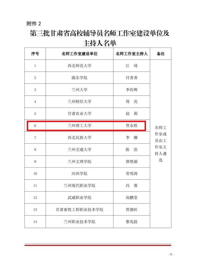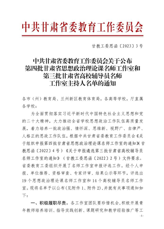 近日,甘肅省委教育工委發布《第四批甘肅省思想政治理論課名師工作室和第三批甘肅省高校輔導員名師工作室主持人名單的通知》,經資格審查、專家評審、結果公示等環節,評選出14個高校輔導員名師工作室,我校經濟管理學院輔導員賈永勝申報的“青春引路人輔導員名師工作室”獲批第三批甘肅省高校輔導員名師工作室,這是我校輔導員隊伍建設工作中取得的又一佳績。