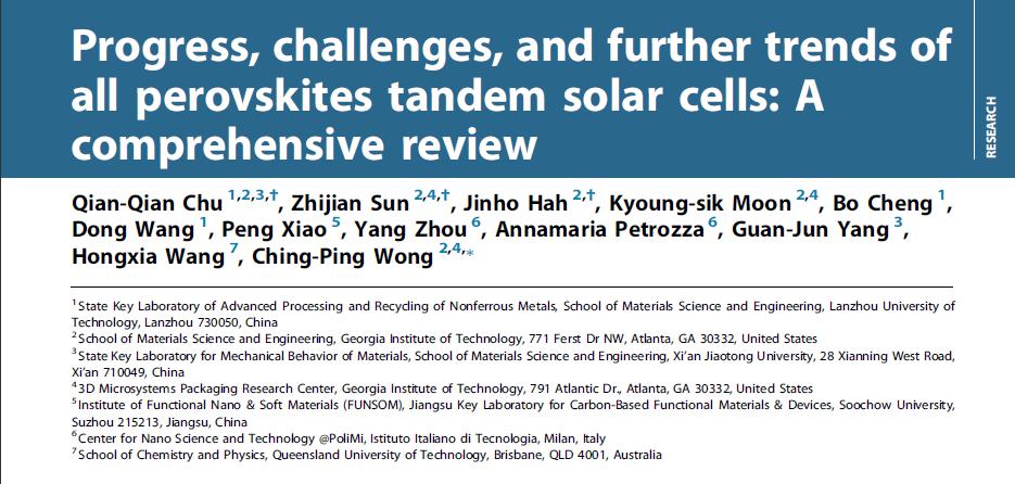 蘭州理工大學(xué)省部共建有色金屬先進(jìn)加工與再利用國(guó)家重點(diǎn)實(shí)驗(yàn)室材料科學(xué)與工程學(xué)院楚倩倩副教授成波副研究員在國(guó)際頂級(jí)期刊《Materials Today》(影響因子:24.2中科院區(qū))上發(fā)表題為《Progress, challenges, and further trends of all perovskites tandem solar cells: A comprehensive review》的鈣鈦礦太陽(yáng)能電池研究綜述論文。蘭州理工大學(xué)省部共建有色金屬先進(jìn)加工與再利用國(guó)家重點(diǎn)實(shí)驗(yàn)室、材料學(xué)院為第一完成單位,合作通訊作者為西安交通大學(xué)楊冠軍教授、澳大利亞昆士蘭科技大學(xué)Hongxia Wang教授以及佐治亞理工學(xué)院Ching-Ping Wong院士