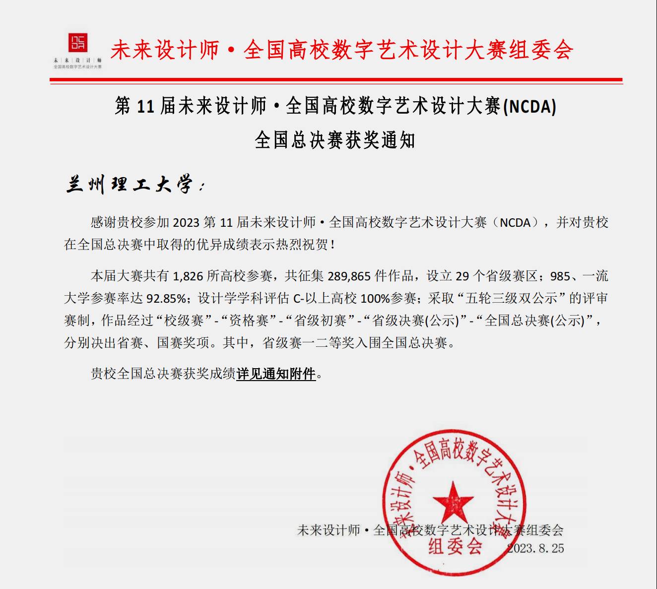 近日,2023第11屆未來設計師·全國高校數字藝術設計大賽(NCDA)全國總決賽獎項公布。在1826所參賽高校中征集的289865件作品中,我校共有35件作品獲得國家級獎項,位列全省高校首位。其中,研究生組獲獎25項(一等獎4項、二等獎10項、三等獎11項),本科生組獲獎10項(一等獎3項、二等獎1項、三等獎6項)。此外,作為甘肅賽區的承辦院校之一,我校很好地完成了甘肅賽區的賽事組織協調工作,在團體組織獎中再次榮獲“卓越貢獻獎”。