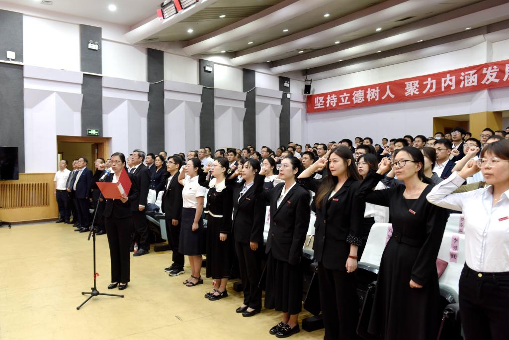 在雄壯的國歌聲中,慶祝大會正式開始。新入職教師在“甘肅省五一勞動獎章”獲得者材料科學與工程學院曹睿的帶領下,面對國旗莊嚴宣誓。