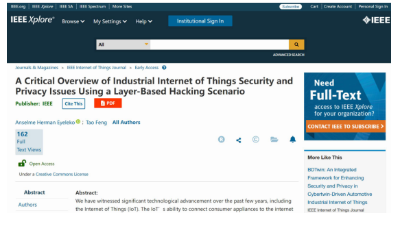 近期,計(jì)算機(jī)與通信學(xué)院網(wǎng)絡(luò)與信息安全團(tuán)隊(duì)的留學(xué)生Anselme Herman Eyeleko博士在國(guó)際權(quán)威期刊<IEEE Internet of Things Journal>(影響因子:10.6)發(fā)表了題為“A Critical Overview of Industrial Internet of Things Security and Privacy Issues Using a Layer-Based Hacking Scenario”綜述文章。馮濤教授為通訊作者,Anselme Herman Eyeleko博士為第一作者。