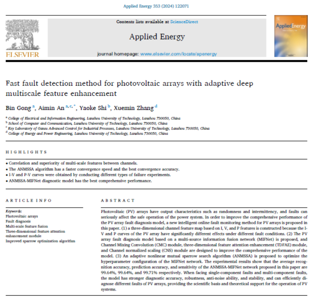近日,電信學院自動化系安愛民教授團隊的2022級博士生鞏彬在能源和燃料領域國際知名Top期刊《Applied Energy》(世界能源領域著名學術SCI期刊, IF="11.446,CiteScore20.4,ESI全球工程期刊第4,中科院一區)在線發表題為“Fast fault detection method for photovoltaic arrays with adaptive deep multiscale feature enhancement”(作者:鞏彬、安愛民、石耀科、張學民)的高水平論文。安愛民教授為論文的通訊作者,博士生鞏彬為第一作者,蘭州理工大學電氣工程與信息工程學院為第一通訊單位。