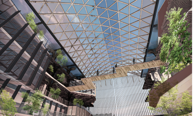 為了更加突出作品的特色,方案注重細(xì)節(jié)的設(shè)計(jì),如光線引導(dǎo):山谷中庭屋面網(wǎng)殼中部采用鋁合金材料,兩側(cè)部分中庭均采用輕盈的大跨空間結(jié)構(gòu),減小了結(jié)構(gòu)對內(nèi)部空間采光的影響,光線與人的運(yùn)動賦予了整個(gè)空間的活力,達(dá)到了讓光線來做設(shè)計(jì)的效果。將鋼、鋁兩種材料綜合運(yùn)用,設(shè)計(jì)出鋼鋁組合網(wǎng)殼,通透采光的同時(shí),造型美觀,使中庭山谷與天空遙相呼應(yīng),讓中庭山谷融入大自然;天然植物纖維在圍護(hù)墻板中的應(yīng)用降低了成本的同時(shí),也契合了可持續(xù)發(fā)展主題。考慮到建筑、人、自然之間的對話關(guān)系消解建筑的體量感,讓中庭山谷更好的融入自然環(huán)境中。