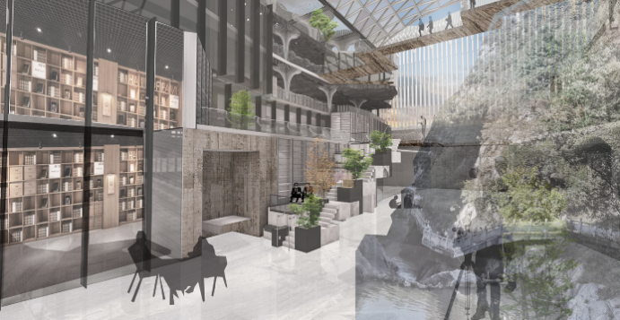 作品以蘭州到成都的必經(jīng)之路——清幽綺麗、青山對峙、澗流清澈的西狹頌景區(qū)為設(shè)計(jì)靈感,結(jié)合甘肅特色的當(dāng)?shù)匚幕O(shè)計(jì)出流動山谷中庭;一層立面使用了甘肅特有的紅磚,體現(xiàn)了甘肅特色文化——馬家窯文化。結(jié)合現(xiàn)代建筑的理性,將特有的文化與建筑融合,將建筑師以及當(dāng)?shù)厝说那閼讶谌氲浇ㄖ校尭嗟谋就粱赜酶碌姆绞襟w現(xiàn),使建筑更具特色,打破了千篇一律的設(shè)計(jì)模式。