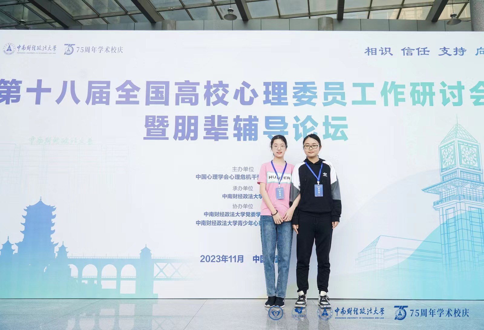 11月1日至3日,第十八屆全國高校心理委員工作研討會暨朋輩輔導論壇在中南財經政法大學召開。中國心理學會理事、中南財經政法大學相關領導出席,全國九百余名心理健康教育工作者和心理委員參加了此次大會。會議發布了第六屆百佳心理委員評審結果,我校電信學院2020級電氣工程及其自動化紅柳基地班王雨萱同學榮獲“全國百佳心理委員”稱號,外語學院2021級日語班徐鈞怡同學榮獲“全國百佳心理委員提名獎”。