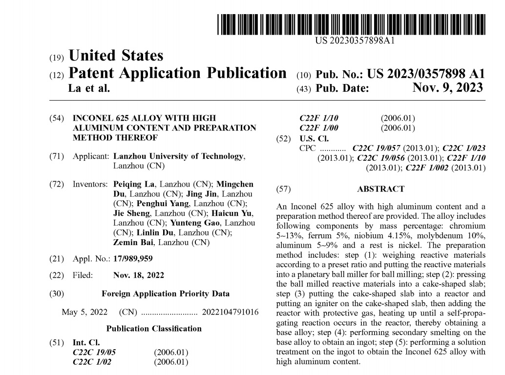 近期,省部共建有色金屬先進加工與再利用國家重點實驗室喇培清教授團隊研究成果《一種高鋁Inconel 625合金及制備方法》獲得美國專利局授權,以上研究工作由國家重點實驗室獨立完成,第一發明人為喇培清教授。
