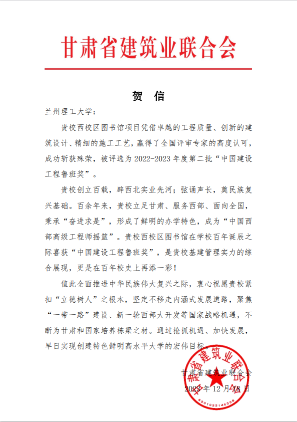 彭珍瑞表示,彭家坪校區圖書館作為學校彭家坪校區標志性建筑,在建筑設計、功能布局、館藏建設、讀者服務等方面都獨具巧思,集學習服務中心、信息資源中心、文化交流中心、創新研究中心于一體,滿足師生讀者文獻查閱、信息服務、學習互動等多元化需求,賦能學校文化建設,提升學校整體形象。該項目先后斬獲教育部2021年度優秀勘察設計建筑設計三等獎、甘肅省建設工程“飛天金獎”等多項榮譽,此次又成功獲評“魯班獎”,這是學校的榮譽,更是我省建筑行業的榮譽,是參建各方凝心聚力,精誠合作的結果,這份榮譽來之不易,我們應當倍加珍惜。“魯班獎”不僅僅是一個獎項,它更象征著一種聚焦最好、錨定最優、惟實勵新、精業篤行的精神。我們以此為契機,化榮譽為責任,以榮譽添動力,激發廣大師生在工作學習中的標桿意識,講好紅柳故事、塑好紅柳典型、傳承紅柳精神,鏈接人才培育、成長成材各個環節,自信自強、守正創新、踔厲奮發、勇毅前行。今后,我們將初心如磐,使命在肩,始終堅持以習近平新時代中國特色社會主義思想為指導,深入貫徹落實黨的教育方針,堅持立德樹人根本任務,珍惜榮譽啟新程,砥礪奮進譜新篇,為學校高質量內涵式發展再助力、再添彩。
