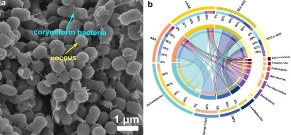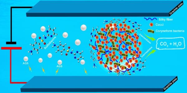 當(dāng)前,隨著城鎮(zhèn)化進(jìn)程加速和工業(yè)化發(fā)展,水處理面臨著巨大挑戰(zhàn)。好氧顆粒污泥結(jié)構(gòu)由外而內(nèi)分為好氧區(qū)、缺氧區(qū)和厭氧區(qū),這種獨(dú)特的結(jié)構(gòu)賦予其同步礦化有機(jī)污染物、脫氮和除磷能力,在水處理方面潛力巨大,同時(shí)顆粒污泥存在培養(yǎng)周期長(zhǎng)、系統(tǒng)不穩(wěn)定等瓶頸。針對(duì)此問題,團(tuán)隊(duì)將微電場(chǎng)引入好氧顆粒污泥系統(tǒng),有效縮短了污泥造粒周期,增強(qiáng)了顆粒穩(wěn)定性。通過微電場(chǎng)對(duì)微生物選擇,提高了耦合系統(tǒng)對(duì)抗生素廢水的處理效能,研究成果具有廣泛的應(yīng)用前景。