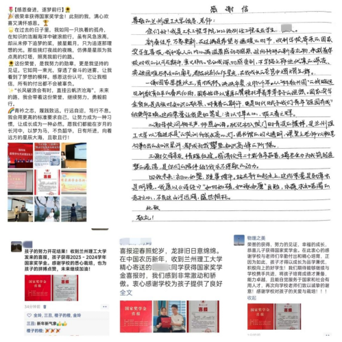 一張張喜報,滿載著學校的深情祝福與殷切期望,跨越山海,抵達一位位學子家中,彰顯了對學生的鼓勵與認可,對家長在學校人才培養過程中給予的支持表示感謝。學生和家長們反響熱烈,內心自豪激動,紛紛表示這份蘭理工專屬的“新春祝福”太具“儀式感”。許多同學和家長第一時間在社交平臺曬出喜報定格榮耀時刻,親手寫下感謝信、發回幸福合影,表達對學校的感謝。
