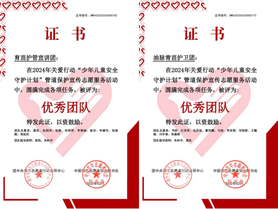 近日,團中央青年志愿者行動指導中心和中國青年志愿者協會秘書處聯合公布了2024年全國大學生關愛行動“少年兒童安全守護計劃”管道保護宣傳志愿服務項目優秀團隊名單,蘭州理工大學石油化工學院的“油脈青苗護衛團”與“育苗護管宣講團”在全國1000支團隊中脫穎而出,榮獲2024年全國大學生志愿宣講項目“優秀團隊”榮譽稱號,全國僅100支團隊獲得該項榮譽。