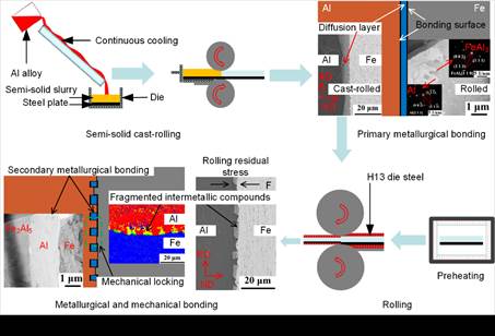 研究團隊針對鋁/鋼復(fù)合板界面脆性金屬間化合物導(dǎo)致的結(jié)合強度低、協(xié)同變形能力差等難題,提出了一種半固態(tài)流變鑄軋技術(shù)制備鋁/鋼復(fù)合板的方法,融合了半固態(tài)澆鑄軋制與流變澆鑄軋制兩大先進工藝。通過鋁合金中硅元素含量、鋼側(cè)表面狀態(tài)、復(fù)合板體軋制工藝調(diào)控鋁/鋼復(fù)合板的界面組織、結(jié)合方式、力學(xué)性能,創(chuàng)新性地構(gòu)建了界面冶金結(jié)合與機械互鎖復(fù)合強化的多尺度優(yōu)化框架,開創(chuàng)了高性能鋁/鋼復(fù)合材料制備的新范式,成功應(yīng)用于6061鋁合金/Q235鋼復(fù)合板的制備,為復(fù)合材料的深加工和應(yīng)用提供了借鑒和理論支撐。