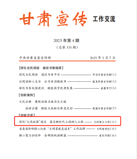 近日,《甘肅宣傳》刊發《深化“大思政課”建設 落實新時代立德樹人工程》一文,從構建思政“大格局”、打造思政 “大課堂”、培育思政“大師資”三個方面,專題報道了蘭州理工大學在“大思政課”建設方面的創新實踐與顯著成效。全文如下: