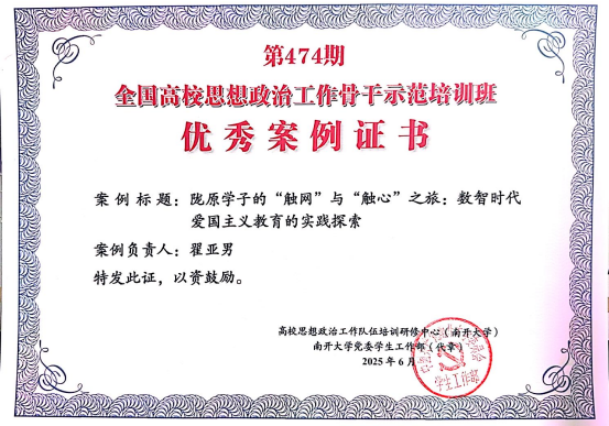 6月9日-12日,由教育部思想政治工作司主辦、高校思想政治工作隊伍培訓研修中心(南開大學)承辦的第474期全國高校思想政治工作骨干示范培訓班在南開大學舉辦。全國部屬高校、部省合建高校及省屬高校的120名思想政治工作骨干參加培訓。我校理學院輔導員翟亞男參加培訓班,撰寫的工作案例《隴原學子的“觸網”與“觸心”之旅:數智時代愛國主義教育的實踐探索》獲評“優秀案例”,并進行案例分享。