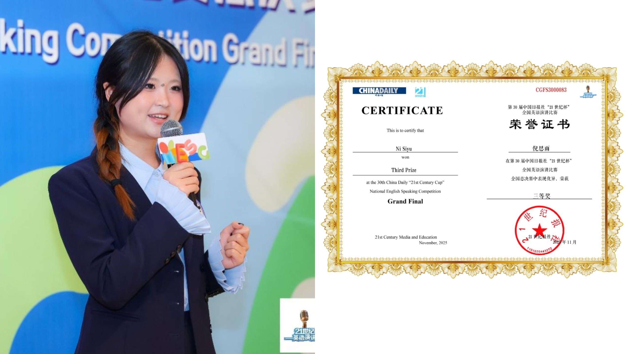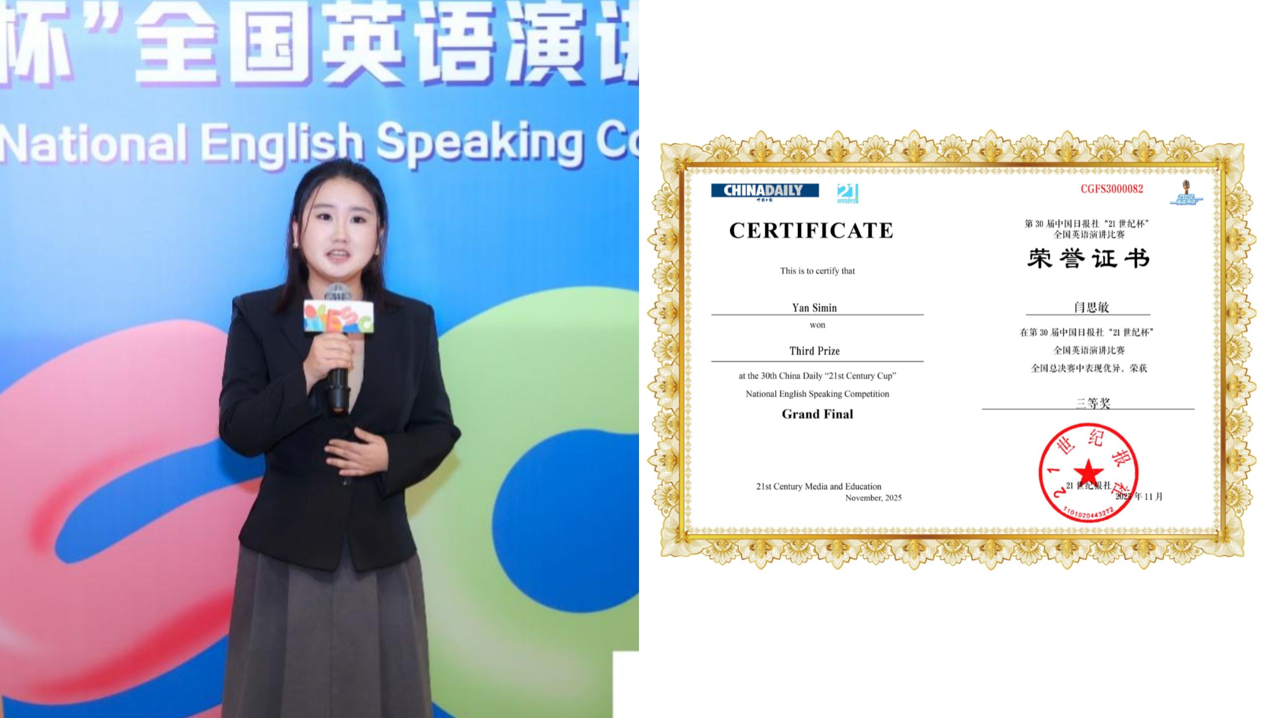 11月13日至17日,在杭州落幕的第30屆中國日報社“21世紀杯”全國英語演講比賽全國總決賽上,外國語學院學子斬獲全國三等獎2項。參賽同學的英語語言功底扎實,演講主題鮮明、內容充實,邏輯層次清晰,表達流暢自然,既傳遞了青年視角的思考,又展現了當代大學生的精神風貌,贏得了評委團的專業認可。