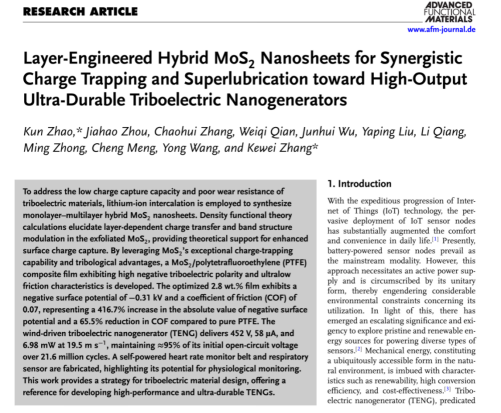 近日,省部共建有色金屬先進加工與再利用國家重點實驗室在高輸出、超耐用摩擦納米發電機研究中取得重要進展,相關成果標題為“Layer-EngineeredHybrid MoS2 Nanosheets for Synergistic Charge Trapping and Superlubrication toward High-Output Ultra-Durable Triboelectric Nanogenerators”的論文,在國際材料科學領域頂尖期刊《Advanced Functional Materials》(中國科學院一區,TOP期刊,IF:19.0)上發表。該論文以蘭州理工大學省部共建有色金屬先進加工與再利用國家重點實驗室為第一完成單位,趙坤副研究員為第一通訊作者,青島大學張克偉教授為共同通訊作者。