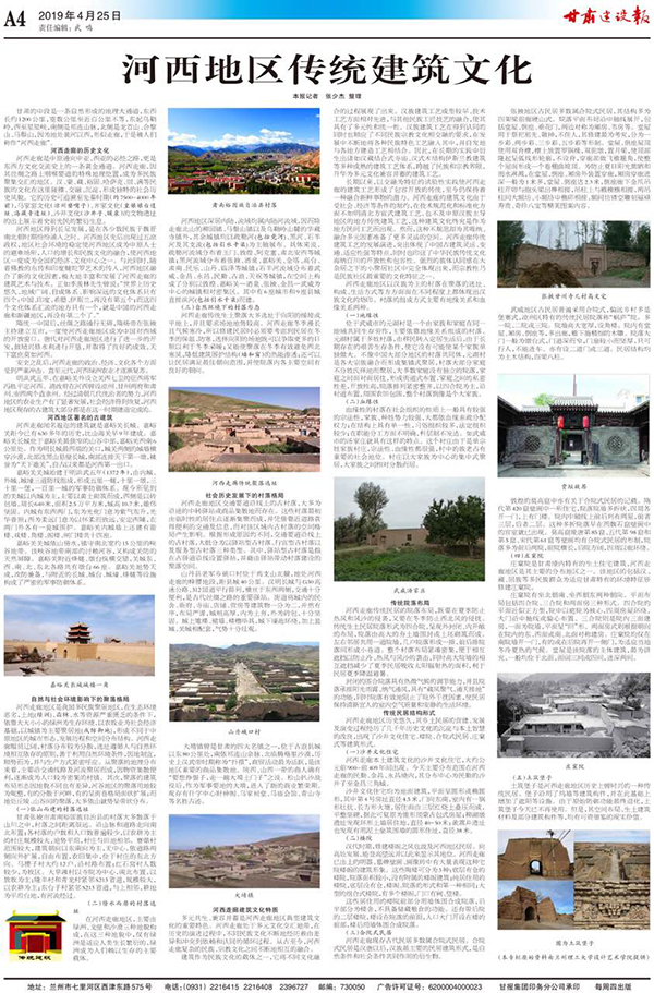 4月25日,省內(nèi)建設(shè)行業(yè)權(quán)威報紙《甘肅建設(shè)報》整版刊登了學(xué)校設(shè)計學(xué)院劉奔騰團隊的系列研究成果,首次全面梳理了河西地區(qū)的傳統(tǒng)聚落與民居文化。該成果是設(shè)計學(xué)院城鄉(xiāng)規(guī)劃系和建筑系多位老師共同協(xié)作,結(jié)合多項縱橫向課題進行深入調(diào)查和研究取得的。