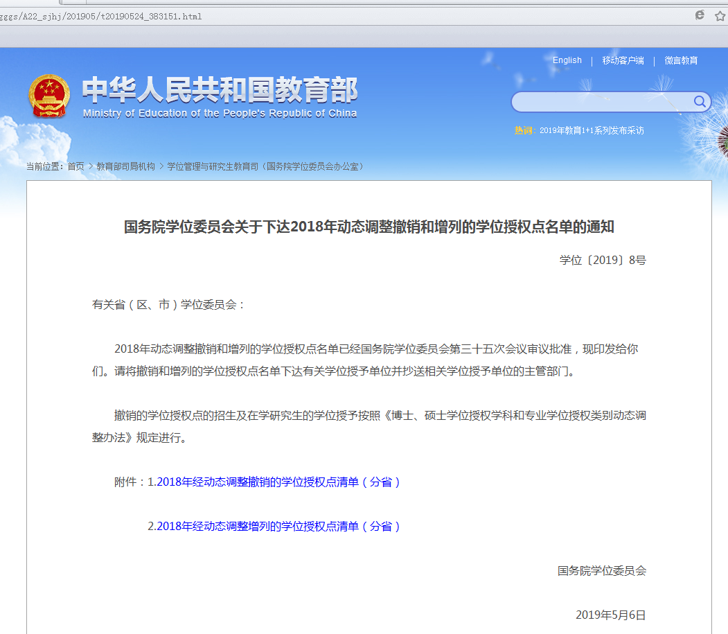 (附件:《關(guān)于下達(dá)2018年動態(tài)調(diào)整撤銷和增列的學(xué)位授權(quán)點名單的通知》)