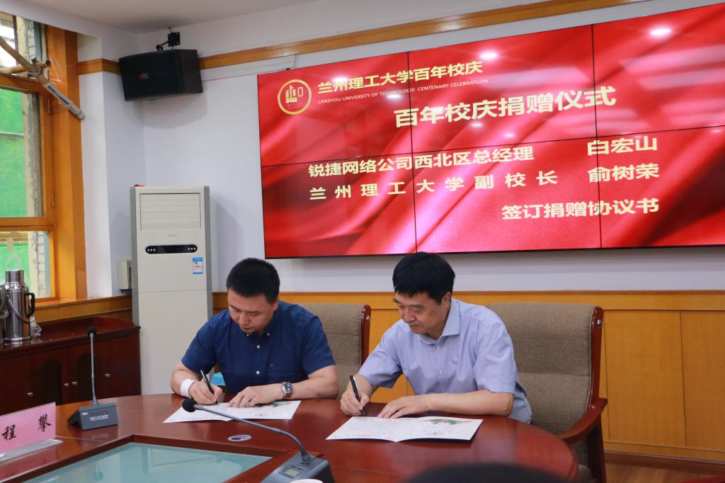 俞樹榮代表學校分別與中國電信股份有限公司蘭州分公司、銳捷網絡股份有限公司簽訂了捐贈協議書。