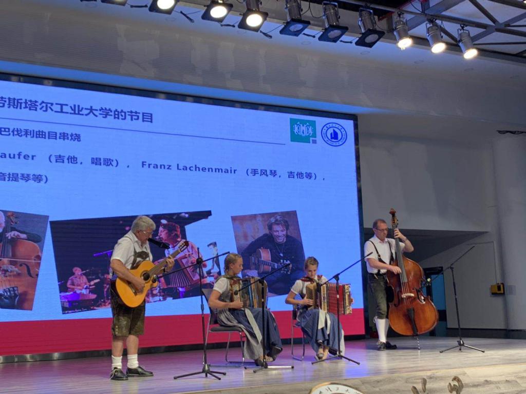 學術報告會后,德國巴伐利亞三人樂隊Maulquappen和施蒂里亞手風琴組合Beargar Steirar Duo為我校師生帶來了極具民族特色的文藝演出,我校紅柳藝術團表演古典舞《書簡》及《生來倔強》的演唱。學校國際合作處、團委、各學院主管國際合作交流的領導、材料、機電、石化、能動、土木、電信、計通、經管、設藝、生命等學院共300余名學生、國際教育學院30名留學生參加了下午的學術報告及文藝演出。