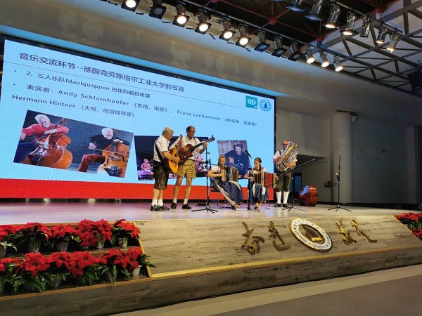 音樂交流中,由德國學生施蒂里亞手風琴雙人組合和三人樂隊Maulquappen 組合分別帶來手風琴樂曲串燒和巴伐利曲目串燒,樂器種類豐富,樂曲優美動聽,表演詼諧有趣,展現了濃郁的德國傳統音樂風格。學校紅柳藝術團帶來了古典舞《書簡》和三人小合唱《生來倔強》。《書簡》舞為中國古典漢唐舞蹈風格,表達了女子手持書簡,熱愛學習,了解天下之事的抱負。舞蹈力度與柔美共存,或素淡,有女兒之嬉戲;或張揚,有書生之抱負,顯示著中華民族之魂。歌曲《生來倔強》用鏗鏘有力的旋律和熱血激蕩的歌詞,唱出中國青年人從不服輸、永不言敗的精神力量,表現了青年人對祖國和民族的熱愛。兩首作品分別展現了中華民族悠久的歷史、文化以及當代中國青年人新的時代風貌。