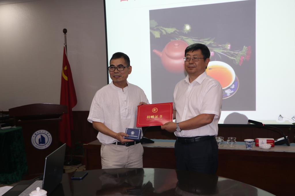 夏天東為洪治校友頒發(fā)捐贈證書,感謝校友對母校一直以來的關(guān)注支持和幫助。