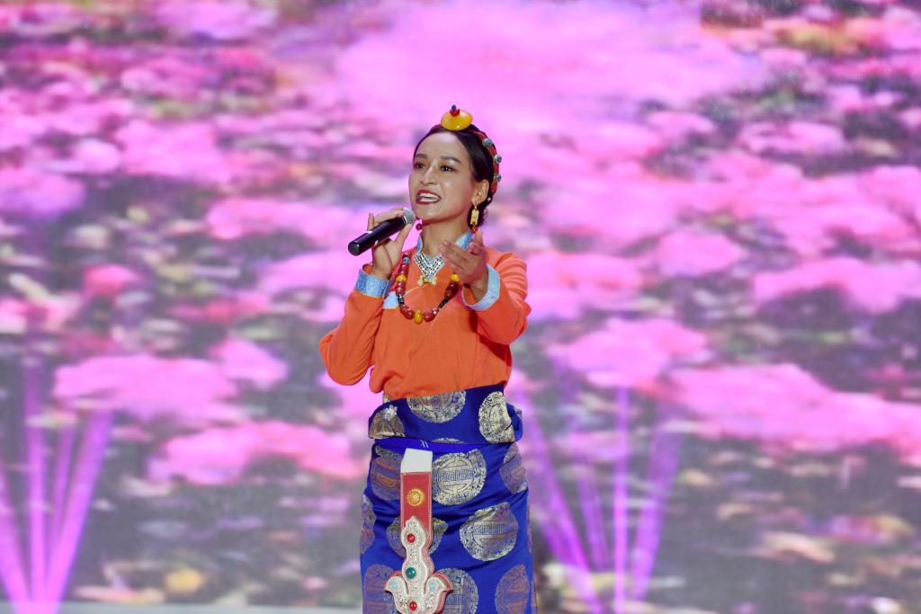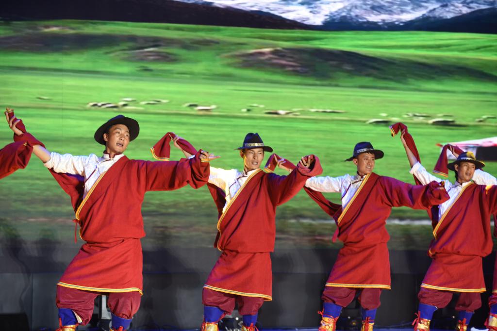 19時(shí)許,演出在藏族舞蹈《歡騰的草原》歡快熱烈的節(jié)奏聲中拉開序幕。隨后,《一個(gè)媽媽的女兒》《去香巴拉看太陽(yáng)》《父親的草原母親的河》《和諧中國(guó)》等經(jīng)典民族歌舞逐一呈現(xiàn),全場(chǎng)爆發(fā)出熱烈的掌聲和歡呼聲。而《豐收》《好山好水好甘南》《藏鄉(xiāng)韻》《褪色的留年》等極具甘南地方特色的歌舞表演,則以高亢的歌喉、奔放的舞姿、美輪美奐的服飾,把人們帶入了美麗的桑科草原。特別是男聲獨(dú)唱《香巴拉并不遙遠(yuǎn)》、牧人彈唱《金色家園》和《雪域歡歌》、男女群舞《則柔》,藝術(shù)地再現(xiàn)了拉卜楞藝術(shù)的激情和魅力。最后,演出在全體演員與觀眾共同高唱《我和我的祖國(guó)》的高潮中圓滿落幕。