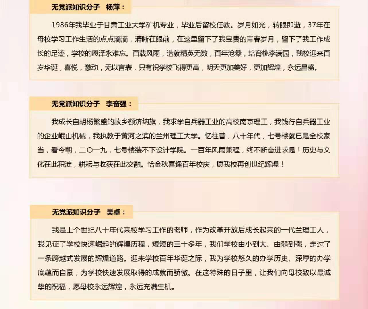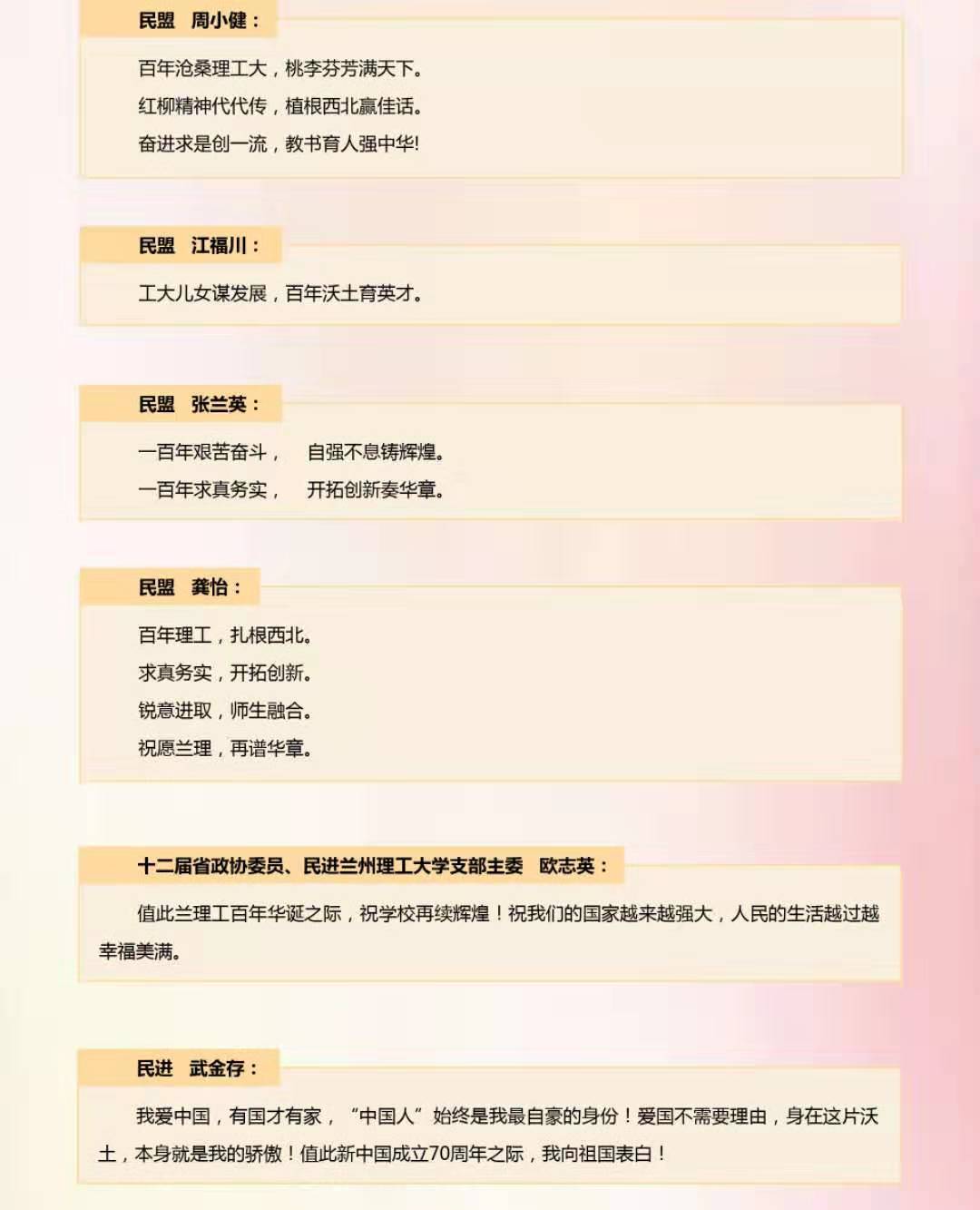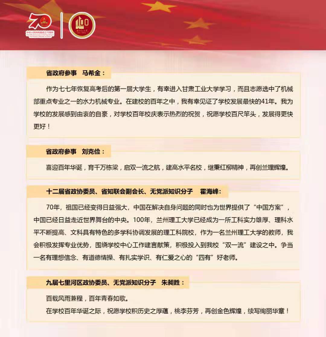 為了慶祝新中國成立70周年和學校百年華誕,學校黨外知識分子通過各種方式抒發對祖國、對母校的感恩和熱愛之情,熱情謳歌黨的領導、禮贊祖國、致敬母校,充分反映出統一戰線成員心系祖國、關心學校的真摯情感,展現了奮進新時代、共筑中國夢的熱切心愿,大家表示將不忘合作初心、把愛國愛校之情轉化為努力奮斗、建功立業新時代的實際行動,繼續攜手前進,共同為學校“雙一流”建設和幸福美好新甘肅貢獻才智和力量。