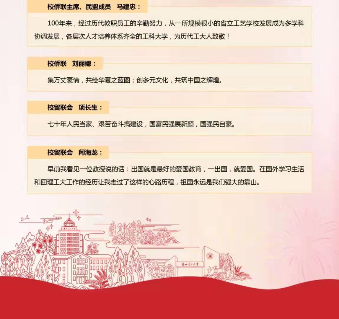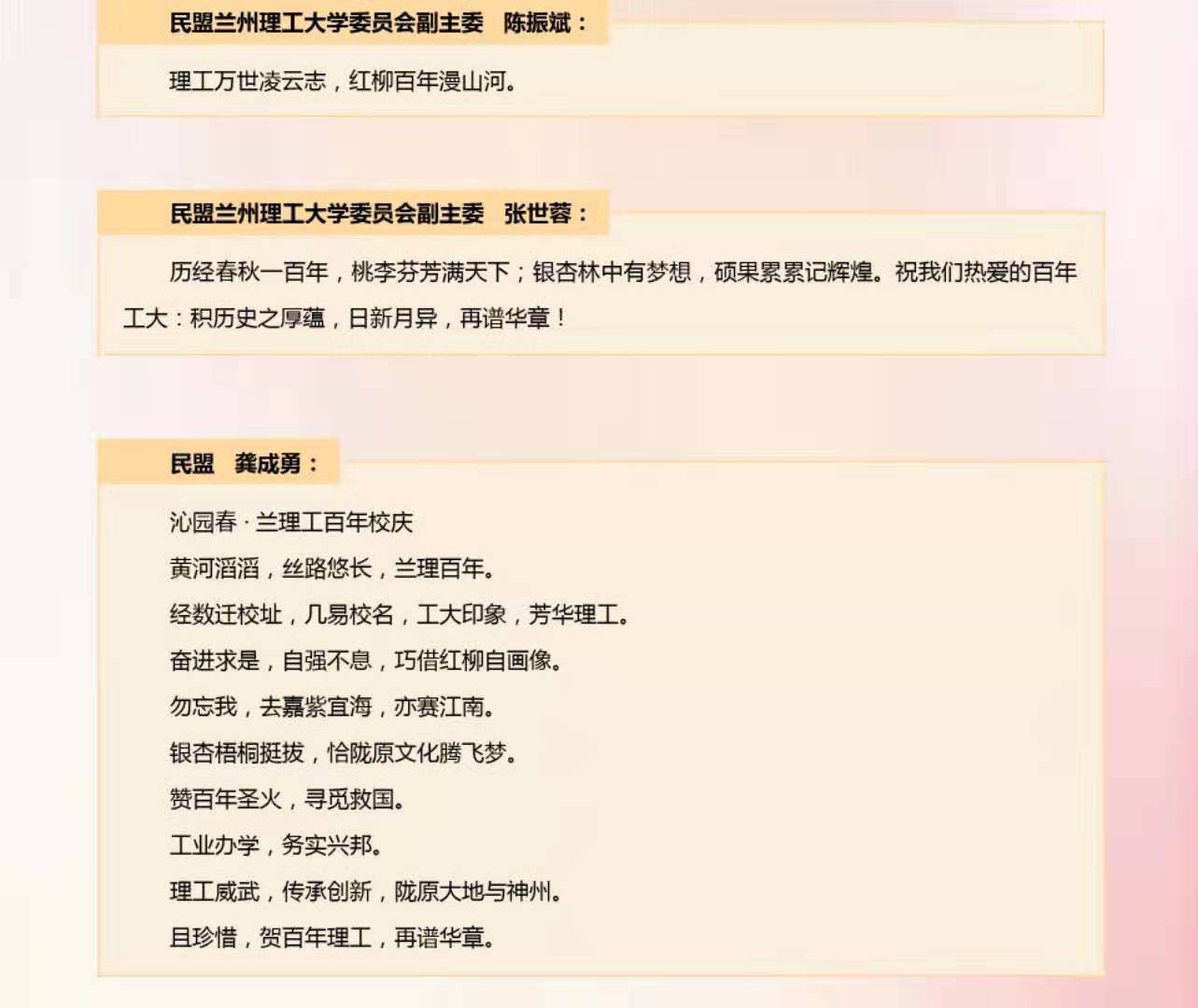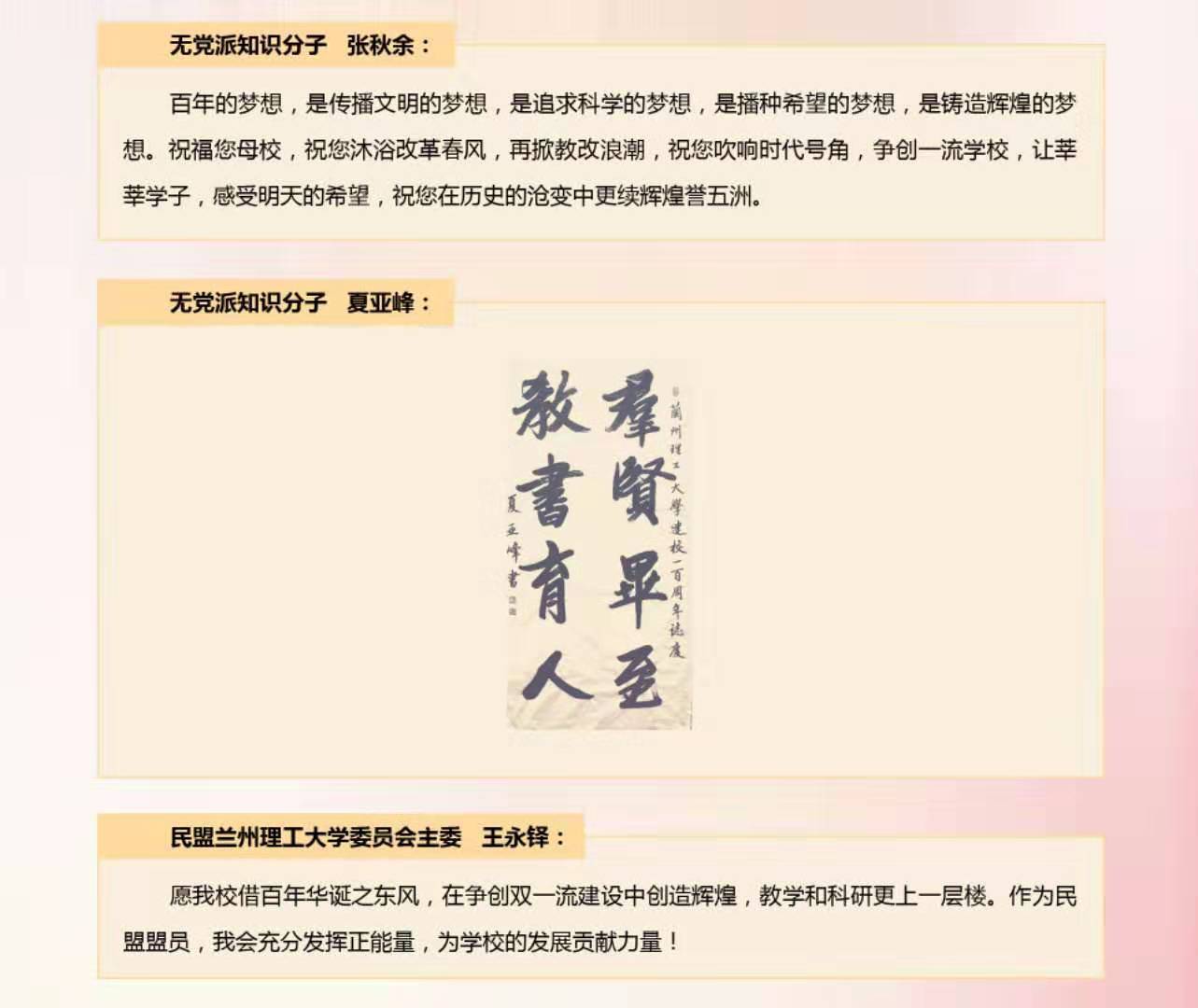 為了慶祝新中國成立70周年和學校百年華誕,學校黨外知識分子通過各種方式抒發對祖國、對母校的感恩和熱愛之情,熱情謳歌黨的領導、禮贊祖國、致敬母校,充分反映出統一戰線成員心系祖國、關心學校的真摯情感,展現了奮進新時代、共筑中國夢的熱切心愿,大家表示將不忘合作初心、把愛國愛校之情轉化為努力奮斗、建功立業新時代的實際行動,繼續攜手前進,共同為學校“雙一流”建設和幸福美好新甘肅貢獻才智和力量。