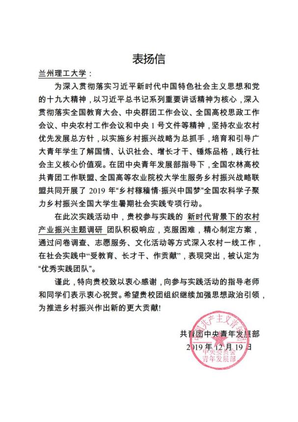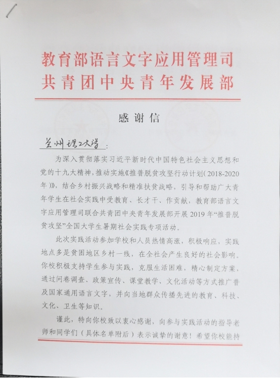近日,教育部語言文字應用管理司、共青團中央青年發展部向蘭州理工大學發來信函,特別感謝文學院“推普脫貧攻堅”暑期實踐隊的突出貢獻,表揚能動學院“新時代背景下的農村產業扶貧調研團”的突出表現。