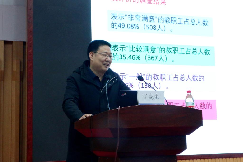 12日下午,丁虎生作題為《學(xué)校意識(shí)形態(tài)工作及教職工思想狀況報(bào)告》的專題輔導(dǎo)報(bào)告。報(bào)告指出,高校是各種思想觀念交鋒的場(chǎng)所,深刻認(rèn)識(shí)和把握抓好高校意識(shí)形態(tài)工作,是新時(shí)代辦好中國(guó)特色社會(huì)主義大學(xué)的根本要求,把習(xí)近平新時(shí)代中國(guó)特色社會(huì)主義思想作為高校意識(shí)形態(tài)工作的指導(dǎo)思想,堅(jiān)守好、建設(shè)好高校意識(shí)形態(tài)堅(jiān)強(qiáng)陣地,是高校肩負(fù)的重要職責(zé)。報(bào)告強(qiáng)調(diào),大學(xué)必須在管理的每個(gè)環(huán)節(jié)上建立平等、民主的關(guān)系,大學(xué)教師和管理人員一定要了解學(xué)生的愿望,關(guān)心學(xué)生的冷暖疾苦,幫助解決學(xué)生的困難,既要教育引導(dǎo)學(xué)生,又要幫助關(guān)心學(xué)生。大學(xué)管理人員要把“精通業(yè)務(wù)、善于組織、熟悉學(xué)生、熱心服務(wù)”作為職業(yè)追求,樹(shù)立嚴(yán)謹(jǐn)務(wù)實(shí)、勤政廉潔的工作作風(fēng)。