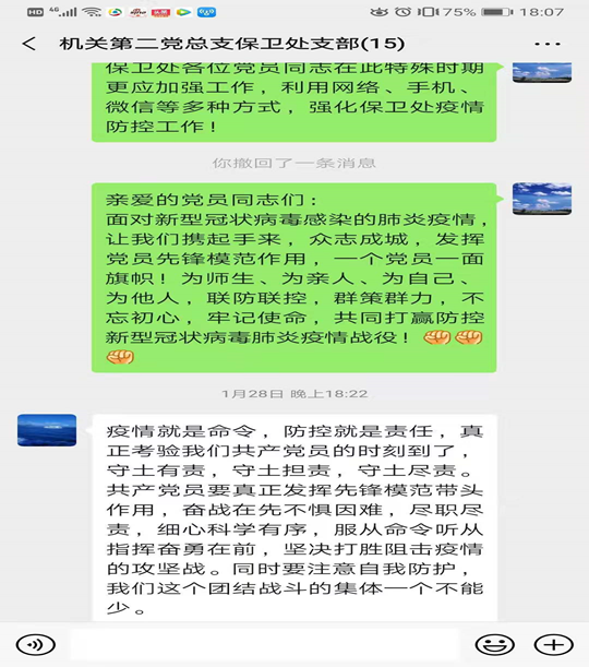 保衛處黨支部第一時間成立了由支部書記擔任組長的防疫工作小組和兩校區黨員突擊隊。支部書記在支部微信群向黨員同志發出“眾志成城,群策群力;不忘初心,牢記使命,共同打贏防疫攻堅戰”的號召。支部黨員干部、入黨積極分子主動放棄休假,投身防疫一線。面對疫情,他們先后制定了防疫值班流程、消毒流程和校園封閉式管理等工作細化措施;與學校各部門、學院溝通了解留校學生和值班人員動態,及時準確統計上報。