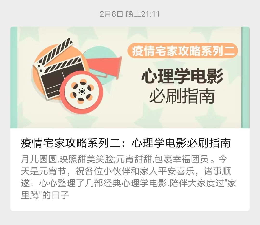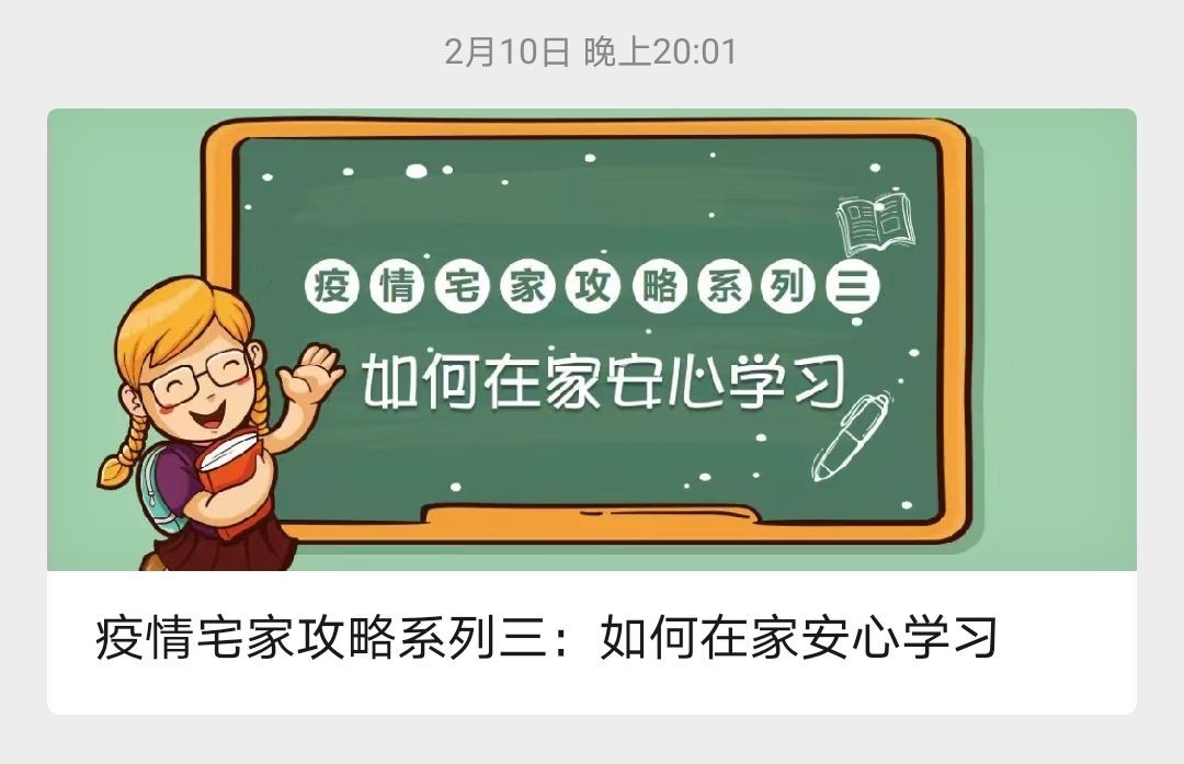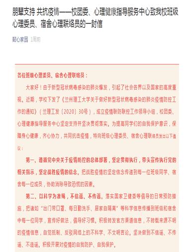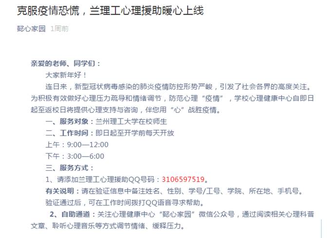 及時向全校師生轉發國家衛健委發布的《新型冠狀病毒防控指南》,動員學生積極觀看高校心理健康教育專家指導委員會組織的《大學生心理應激系列講座》;通過心理健康指導服務中心微信公眾號“懿心家園”、校團委微信公眾號“蘭州理工大學紅柳青年”等媒體,廣泛宣傳國家總體部署,即時推送心理調適文章,推出“疫情宅家指南”系列,發送“疫情來襲心理處方”,鼓勵同學們“動”起來,“刷”起來,“學”起來,引導學生做好日常防護,“不信謠、不傳謠”,利用健康有效的方式度過疫情,把戰勝疫情的堅定信念傳遞到每一位同學心中。