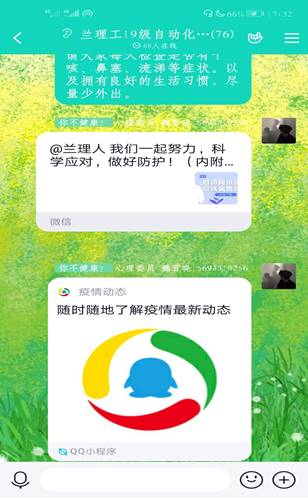 班級心理委員、宿舍心理聯絡員是同學們的心靈健康的覺察者、陪伴者。心理健康指導服務中心向全體班級心理委員、宿舍心理聯絡員推送了《朋輩支持共抗疫情——校團委、心理健康指導服務中心致我校班級心理委員、宿舍心理聯絡員的一封信》,號召朋輩心理引導員在這段特殊時期,維護自身生理、心理健康的同時,利用所掌握的心理專業知識開展“傾聽、陪伴和轉介”,力所能及地為同學提供朋輩支持,穩定班級同學的情緒,減輕心理壓力。心理委員、心理聯絡員們紛紛響應,每日監督班級、宿舍同學做好心理健康狀況的自查與排查,及時發現心理疫情,上報輔導員、班主任和心理健康中心,通過班級QQ群、微信群、QQ空間推送、轉發疫情心理防護相關知識,多方位幫助同學們消除疑慮和恐慌,心理支持工作在每個班級群里火熱開展。