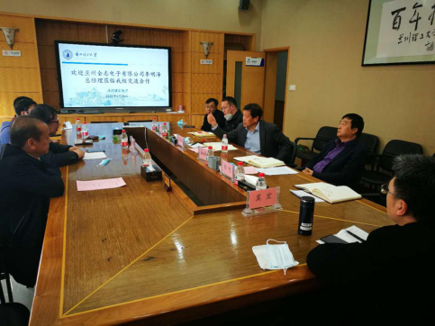 2020年4月26日,蘭州全志電子有限公司總經理李明澤一行來學校對校企聯合產學研項目進行洽談。學校黨委副書記、校長芮執元主持座談會,學校黨委常委、副校長俞樹榮、科技處和計通學院負責人、部分項目參與者參加座談。