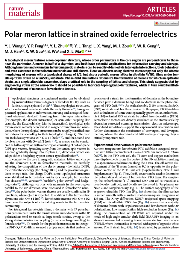 2020年6月1日,國際頂級學術期刊《Nature Materials》在線發表了蘭州理工大學柔性引進專家、中科院金屬研究所馬秀良研究員團隊在鐵電材料拓撲疇結構方面的最新研究成果“Polar meron lattice in strained oxide ferroelectrics”。