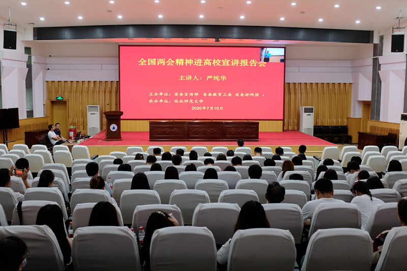 為深入學習貫徹2020年全國兩會精神,7月10日下午,由省委宣傳部、省委教育工委、省委講師團主辦,西北師范大學承辦的全國兩會精神進高校宣講報告會在西北師范大學舉行。全國政協委員、中國科學院院士、蘭州大學校長、省委宣講團成員嚴純華教授為全省高校師生作題為《學習貫徹兩會精神——不忘初心、逐夢前行》的報告。學校黨委副書記丁虎生、全體輔導員、思政理論課專兼職教師、學生代表260余人在逸夫科技館二樓報告廳在線聆聽了報告。