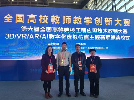 11月10日,由中國高等教育學會主辦的全國高校教師教學創新大賽——第六屆全國高等院校工程應用技術教師大賽3D/VR/AR/AI數字化虛擬仿真主題賽項全國總決賽頒獎典禮在長沙第55屆中國高等教育博覽會上順利舉辦。我校機電工程學院三個團隊獲得全國總決賽一等獎1項,二等獎2項,分別是T1-3D打印與3D設計賽項全國總決賽一等獎(李海燕、康永平、陳衛華、任麗娜、吳卓)、二等獎(魏興春、宋波),T3-面向實訓實踐的VR創新應用賽項全國總決賽二等獎(鄭敏、李海燕、任麗娜、吳卓、周蘭)。