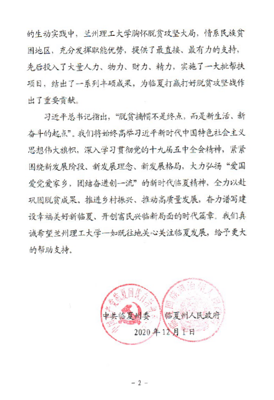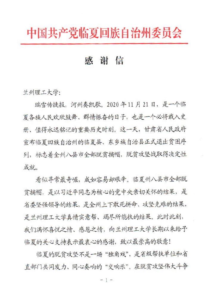 近日,中共臨夏州委、臨夏州人民政府發來感謝信。信中寫到,在脫貧攻堅偉大斗爭的生動實踐中,蘭州理工大學胸懷脫貧攻堅大局,情系民族貧困地區,充分發揮職能優勢,提供了最直接、最有力的支持,先后投入了大量的人力、物力、財力、精力,實施了一大批幫扶項目,結出了一系列豐碩成果,為臨夏打贏打好脫貧攻堅戰作出了重要貢獻。