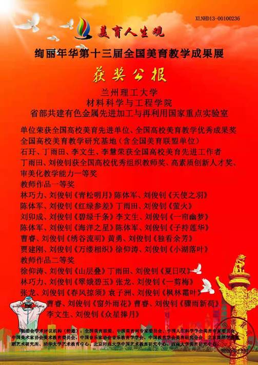 由中國教育學會、中國高等教育學會美育專業委員會等多單位聯合舉辦的第十三屆全國美育教學成果展,于2020年12月初落下帷幕。蘭州理工大學材料學院聯合國家重點實驗室以《材料之美》為載體組織申報了第十三屆美育教育成果展,經全國美育教學成果展評組委會評審,報送的多項作品喜獲佳績。蘭州理工大學獲“全國高校美育先進單位”“全國高校美育教學優秀成果獎”“全國高校美育教學研究基地(含全國美育聯盟單位)”。石玗、丁雨田、李文生、李慧獲“全國高校美育先進工作者”,丁雨田、劉俊釗獲“全國高校優秀組織教師獎”“高素質創新人才獎”“審美化教學能力一等獎”,10名教師獲“教師作品一等獎”,8名教師獲“教師作品二等獎”。