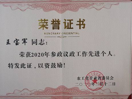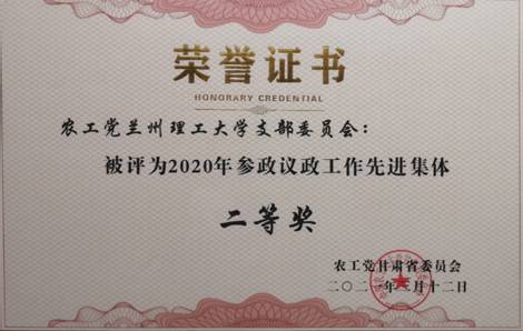 農工黨蘭州理工大學支部委員會被評為2020年參政議政工作先進集體二等獎。農工黨蘭州理工大學支部主委王寶軍同志榮獲參政議政工作先進個人。